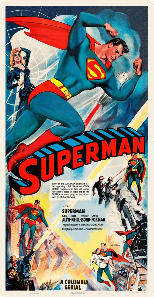 The above poster is a beautiful restoration of a very rare THREE SHEET of Columbia Pictures SUPERMAN (1948) – it’s available on eBay if you’re interested.