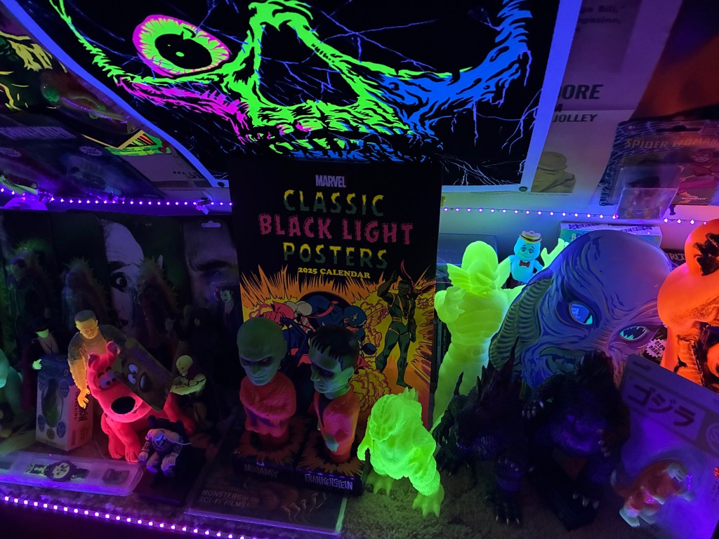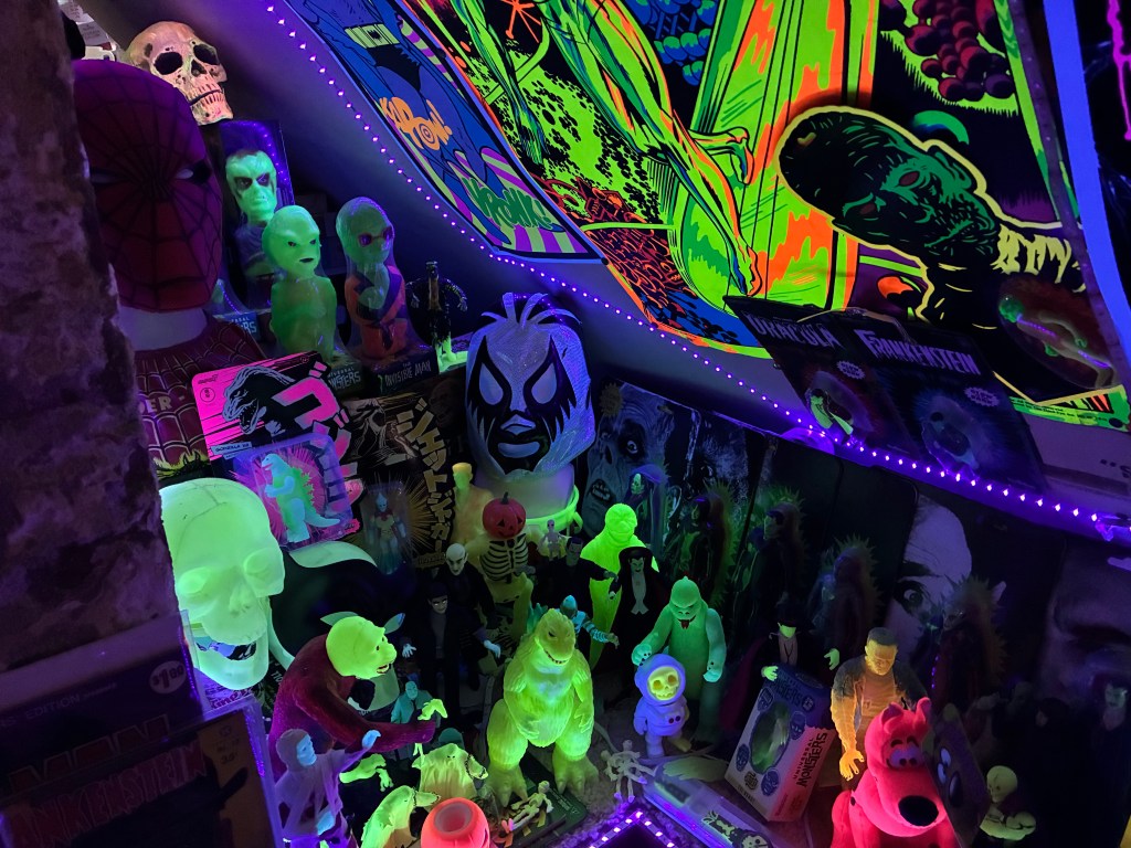 The corner is dark even during the say so I lined it with black light strips so it brings all of the glow and black light items to life.