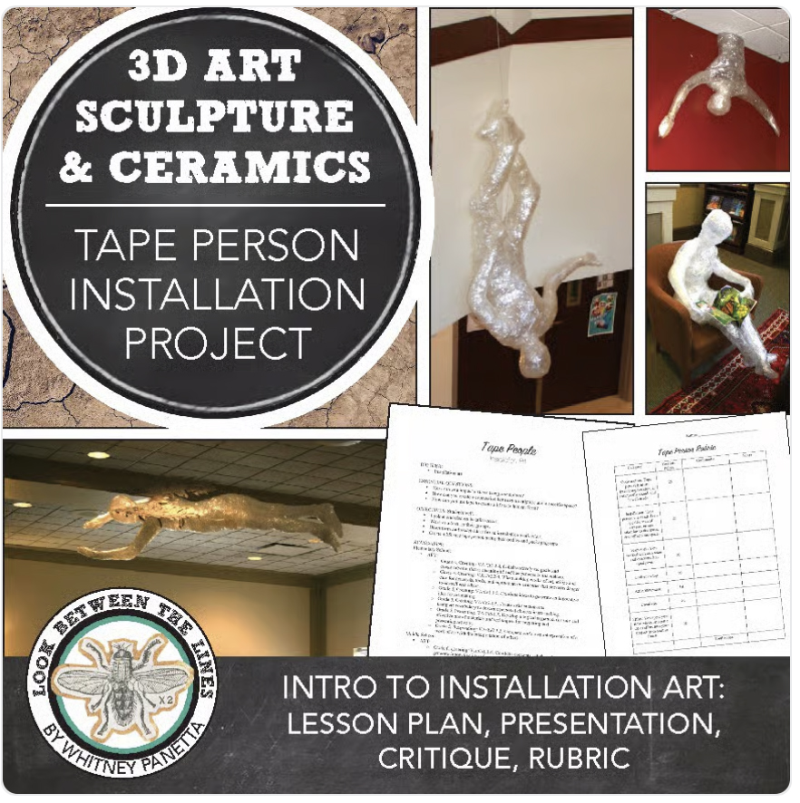 I did this installation quite a few times, and it was a hit everytime. The best one was when I had the students bring in old clothes they no longer wanted or needed (Parental permission of course) and we dressed the tape models– this is why I do the double layers with the good tape because then they are strong enough to stand with those clothes on– the hoodies are a perfect touch because you pull those up to hide the “invisible” head.