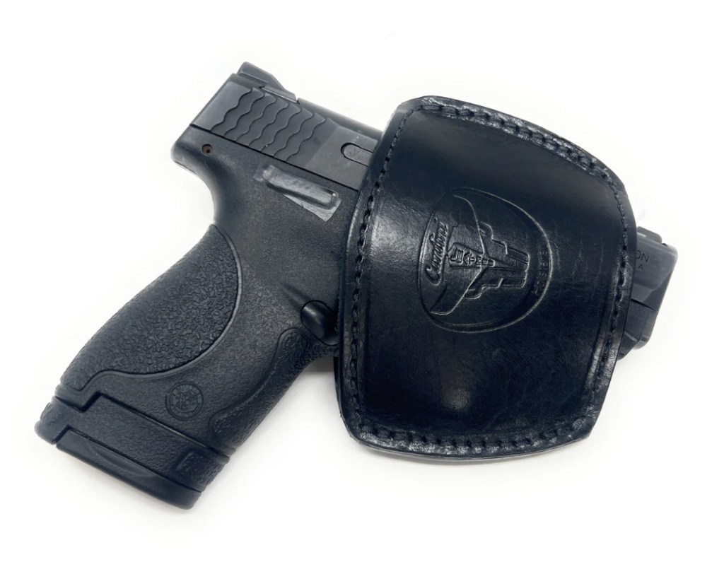 The simplest of the leather holsters is this one above. It’s not pistol specific and sized solely for a small pistol or a large pistol. It’s a piece of leather that sits on your belt and your pistol sits inside that.