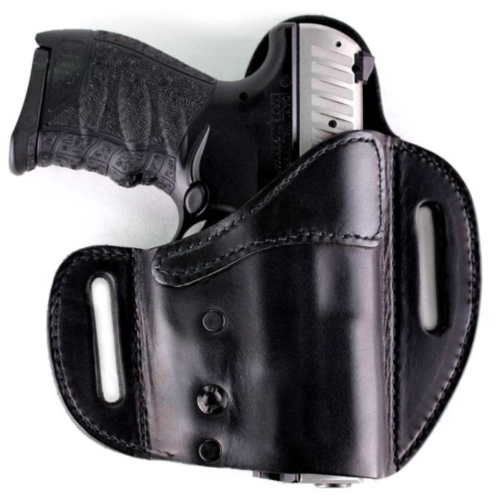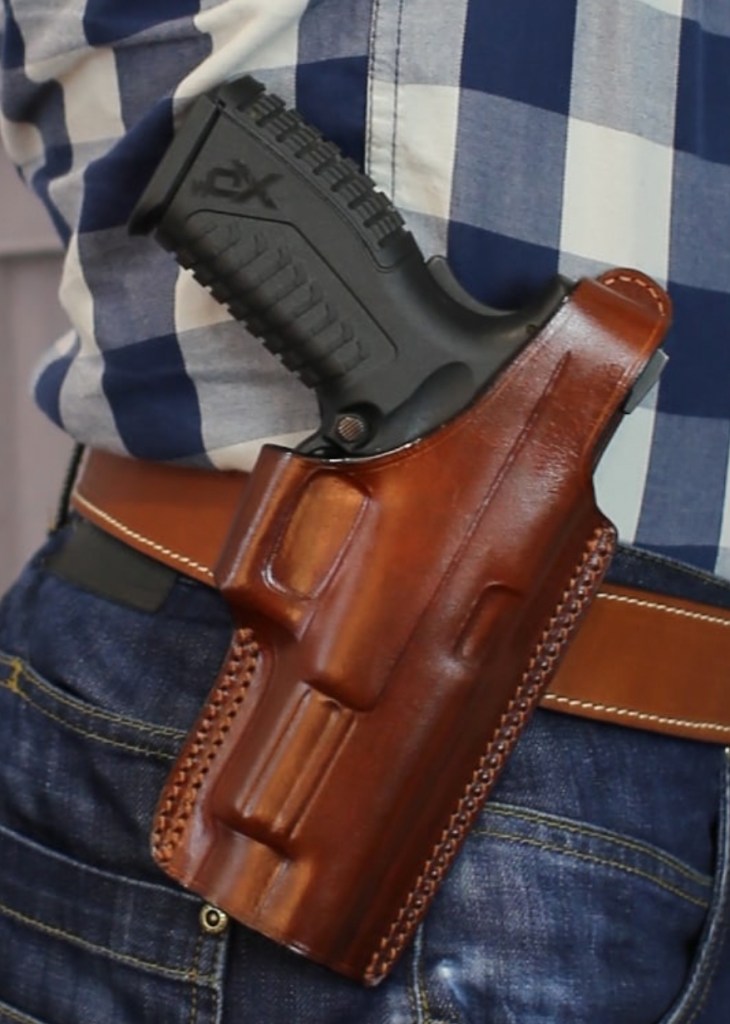 Okay so leather holsters are more comfortable but they don’t have the locking mechanism plastic holsters do– well you can get a nice leather holster with a thumb break– simply put your gun goes in the holster and then a piece of leather goes up and over and snaps it into place. It holds the pistol in place, but it does add about a second to the process if you do need to draw your weapon and in a confrontation seconds count.