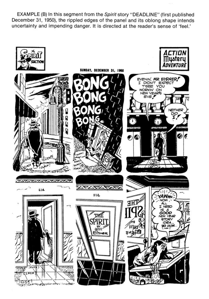 Eisner adds TIMING to the narrative here as the character in the story (himself) makes his way into his office. You can see the use of shadow, varied camera angles and sound effects all add to the narrative.