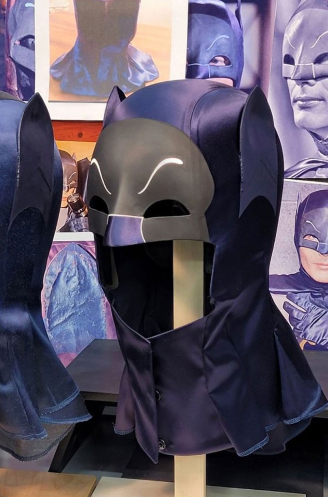 As the Cowl’s aged under those hot lights with poor Adam sweating like crazy in it– the fabric started to pull away and the color faded to a purple. Above is one of the two actual surviving original Batman cowls from the show that have not been recovered with clean fabric.