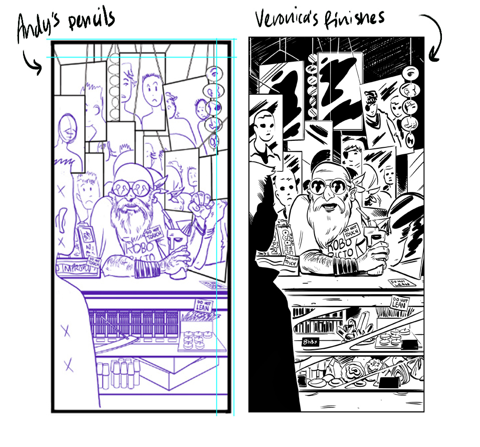 Sometimes Andy and Veronica work together on interiors for comics. Here is an example of Andy’s layout for a page in Blackwood, for Dark Horse Comics, and Veronica’s finishes.