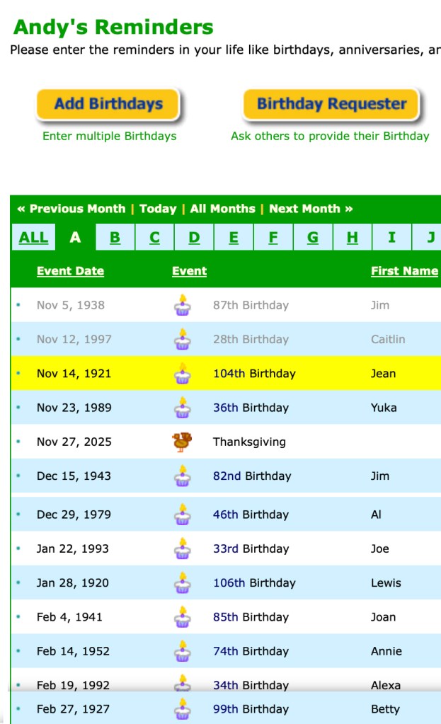 Ironically I have an almost rain-man like ability to remember numbers and dates. I can remember the number to Yellow Cab Company despite not having called a cab in 35 years. I can remember dates equally well, but this Birthday-reminders thing is invaluable because we all know how busy we get.